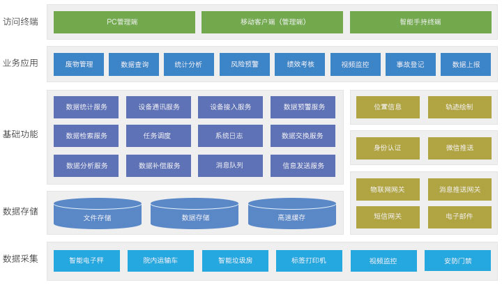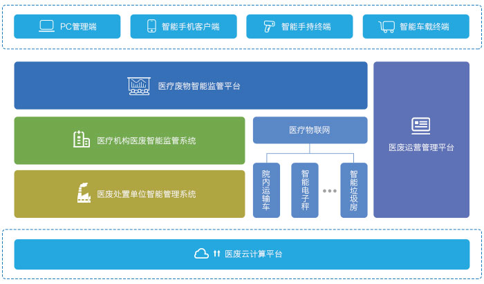 《宇亿医疗废物智能监管系统》以医疗机构的管理要素为核心需求,以医废流转过程为监管路径,通过建立医废档案,在流转中不断归集管理数据,结合视频监控,身份识别,无线射频等技术,建立完整严密的监控,追溯体系。利用大数据技术,对医废管理问题分析和预警,防患于未然。帮助医院管理部门降低管理难度,提升管理精度,提升工作考评能力和问题追责能力。